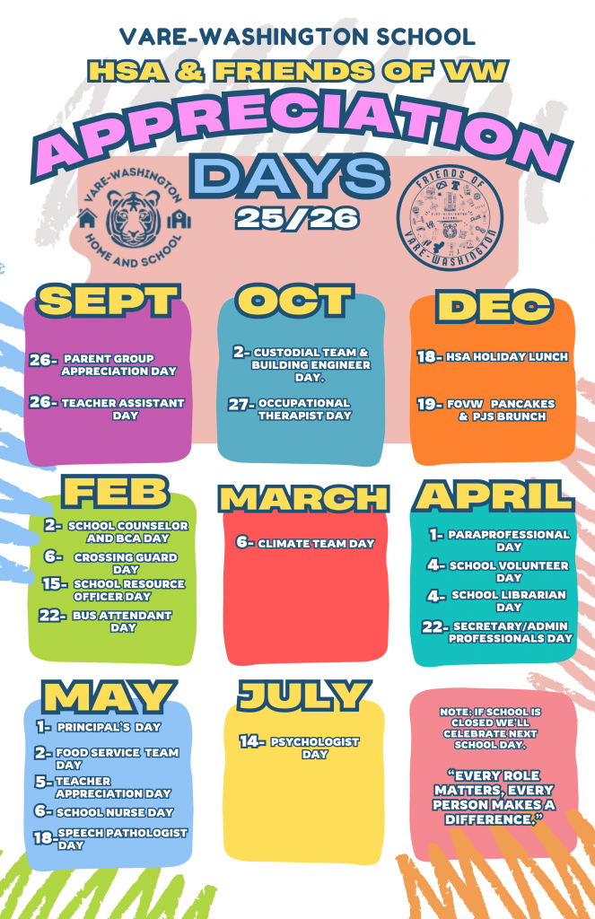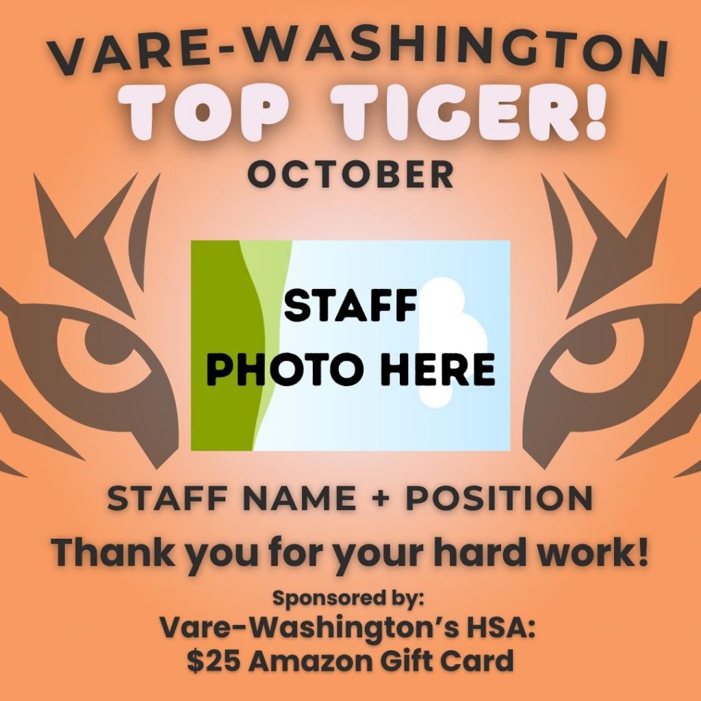 Each month, HSA will recognize one Vare-Washington teacher or staff member who goes above and beyond for our school community. Students, parents/caregivers, administrators, and staff can all submit nominations. Each Top Tiger will be celebrated with a $25 gift card in appreciation of their outstanding contributions! Visit web.vwtigers.com/top-tiger for more information!