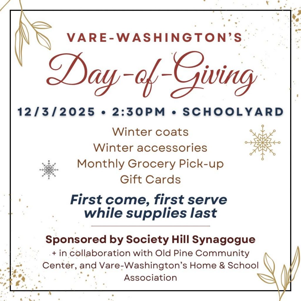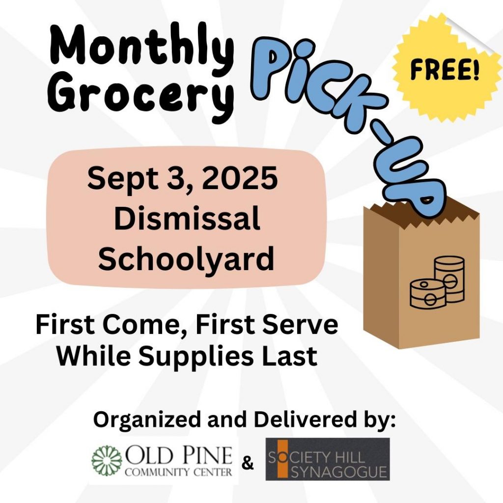 On the first Wednesday of each month, Vare-Washington Families are welcome to pick up a bag of FREE groceries from the schoolyard at dismissal. First come, first serve, FREE 🥰. Organized by HSA, Old Pine Community Center, and Society Hill Synagogue.