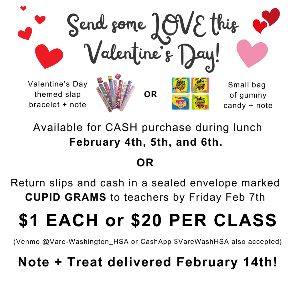 Students can spread some love and joy on Valentine’s Day with Vare-Washington’s Cupid Grams! For just $1, students can send a sweet note along with a candy treat or small toy to a friend, family member, or staff member. It’s a fun and easy way to share kindness and celebrate the season of love. Cupid Grams are an HSA fundraiser.